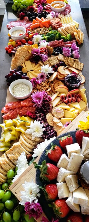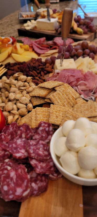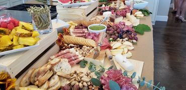 Each table has a selection of artisan cheeses, gourmet cured meats, seasonal fresh fruits and vegetables, dried fruit, nuts, olives, honey, special jams, chocolates, and artisan breads and cracker.